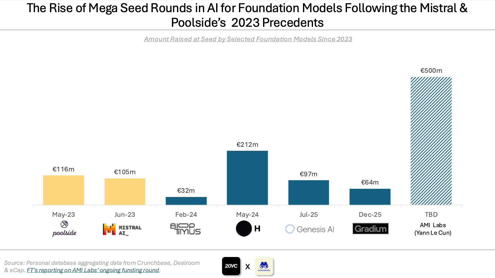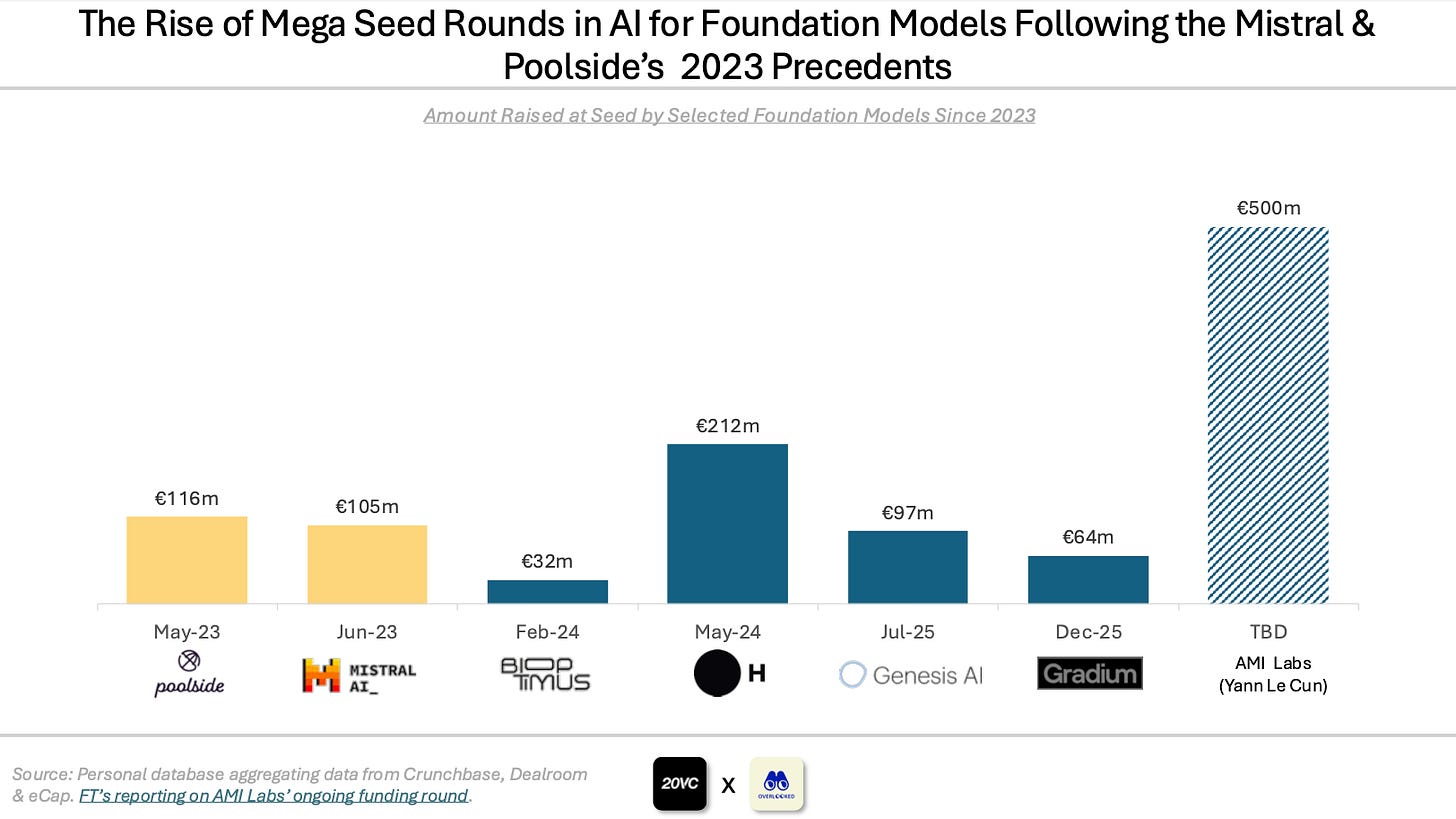 France had multiple mega seed rounds for foundation models in the past 2 years following the Mistral and Poolside’s precedents in 2023 including H (€212m), Bioptimus (€32m), Genesis (€97m) and Gradium (€64m).