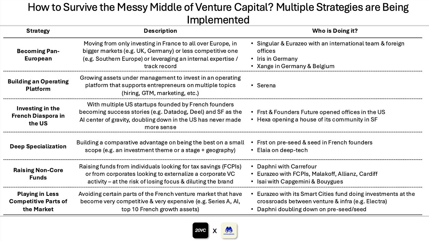 As a result, French VC funds are under pressure & must reinvent themselves, caught in VC’s messy middle between small specialist funds and mega platforms: (i) they struggle to raise their next vintage & when they do, they raise smaller funds, (ii) they lose top Series A rounds to foreign funds & top pre-seed & seed rounds to French micro-funds and European seed players and (iii) top talents are leaving.
