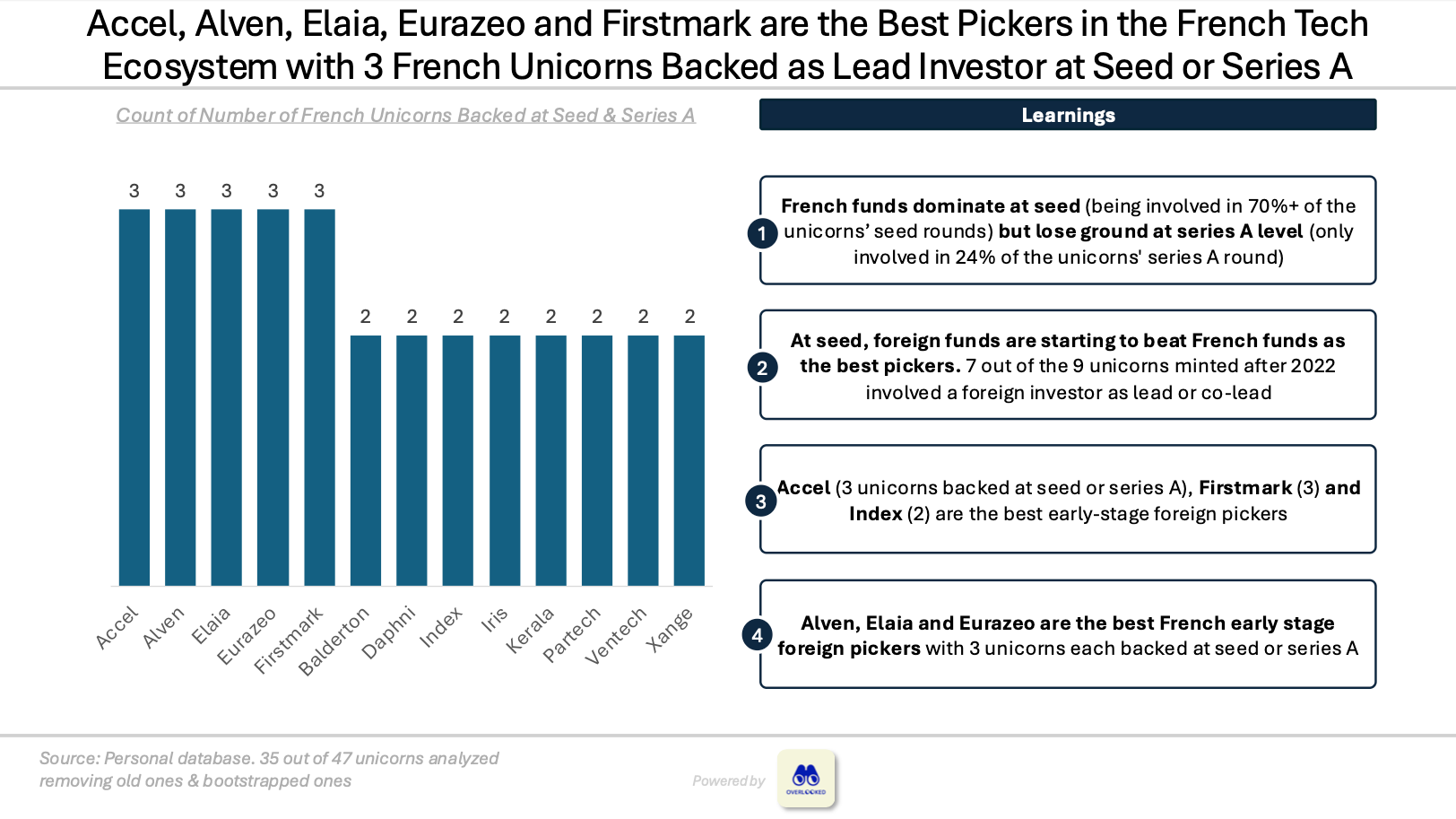 Accel, Alven, Elaia, Eurazeo and Firstmark are the most successful at identifying future unicorns, with each of them backing 3 French unicorns at the seed or series A stage.