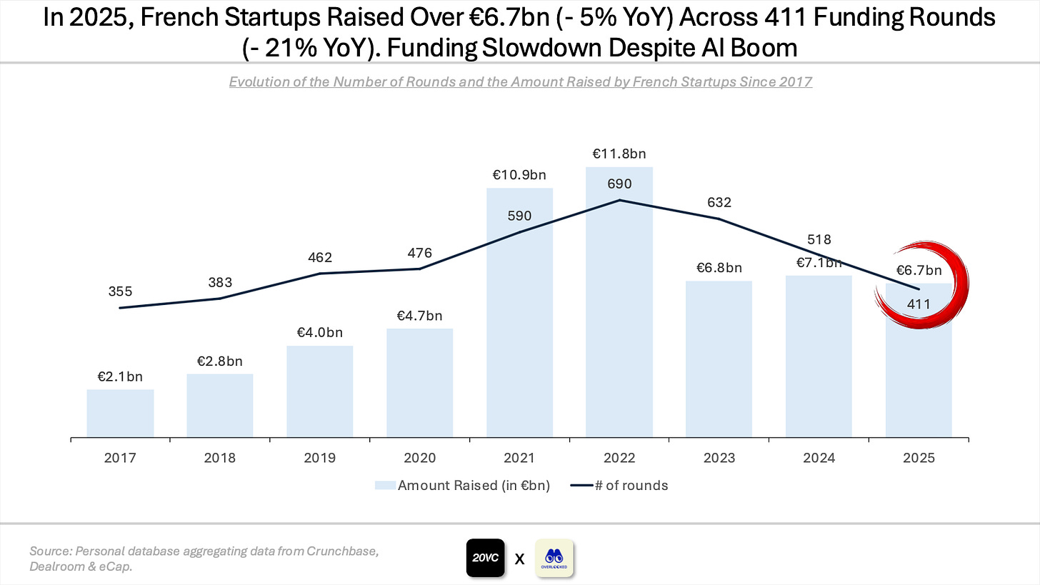 In 2025, French startups raised over €6.7bn (-5% YoY) across 411 funding rounds (-21% YoY). This marks a clear slowdown when the US (+38% YoY growth in funding) and Europe (+12% YoY growth in funding) are both reaccelerating on the back of the AI boom.
