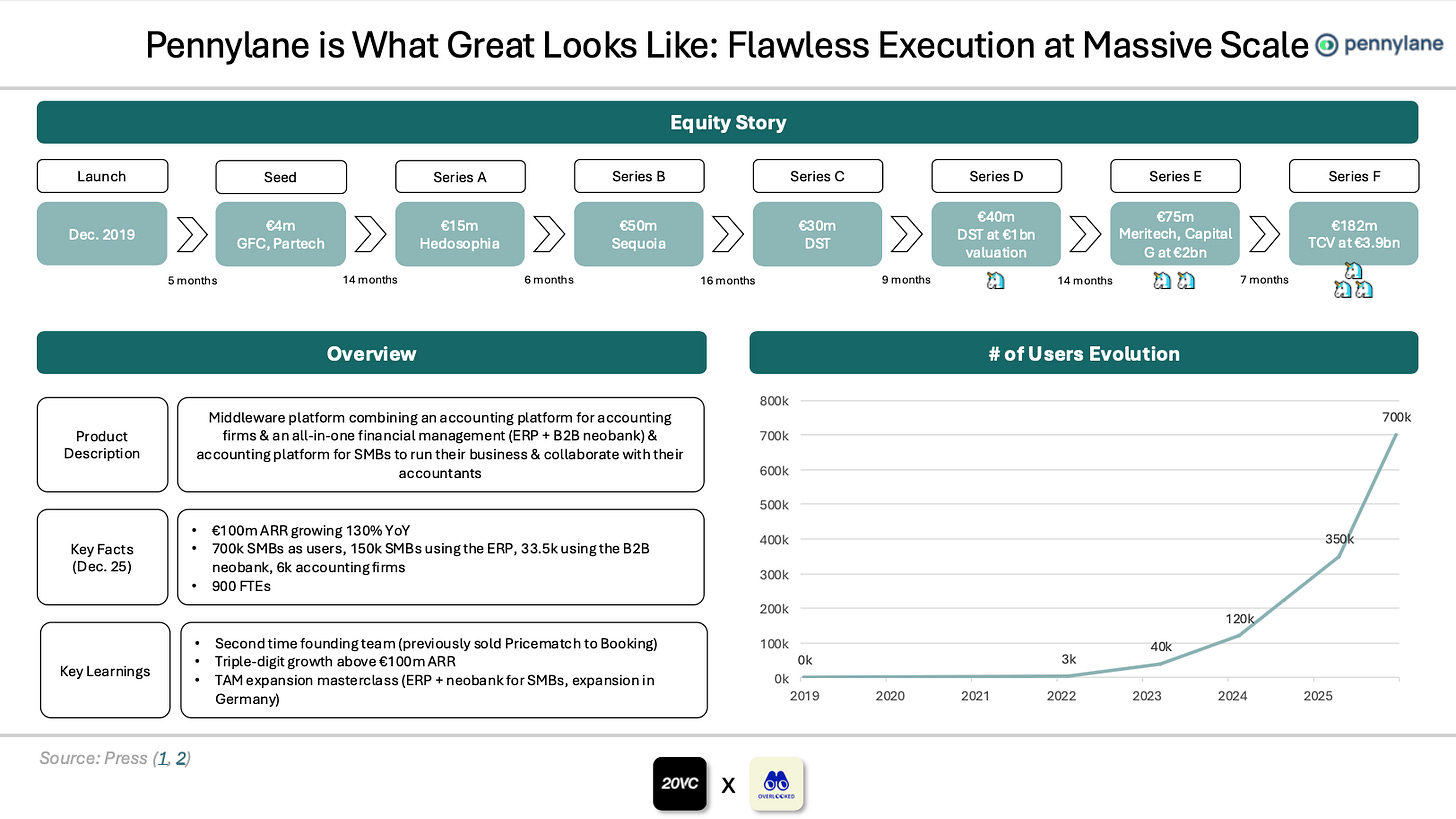 Pennylane was the 2025 French startup of the year with flawless execution at growth scale: (i) €100m ARR threshold bridged, growing 130% YoY, (ii) 2 funding rounds in a year at a respective €2bn and €3.9bn valuation, (iii) market expansion masterclass (becoming the ERP + neobank for French SMBs & opening Germany).